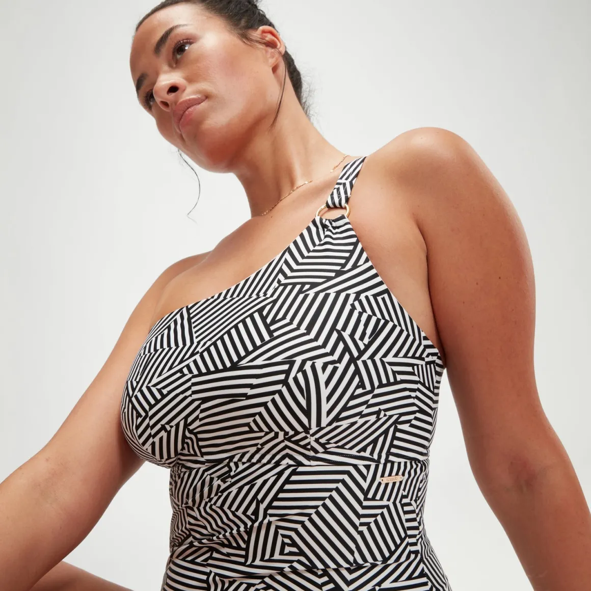 Oozing poolside glamour, this monochrome-print Asymmetric Shaping swimsuit features a sophisticated one-shoulder neckline and a stunning laced back for a customised fit. The chic design is finished with an embossed gold ring at the adjustable strap and includes removable bra pads for support and shaping. Cut from our premium, comfortable body-shaping fabric, which works with the patterned print to smooth and contour the body, it’s ideal for the beach or pool. offering higher chlorine resistance than standard swimwear fabrics, our new shaping fabric fits like new for longer with CREORA® HighClo® . The Nylon yarn in our new shaping fabric is also made from 100% pre-consumer waste, such as waste fabric from factories.