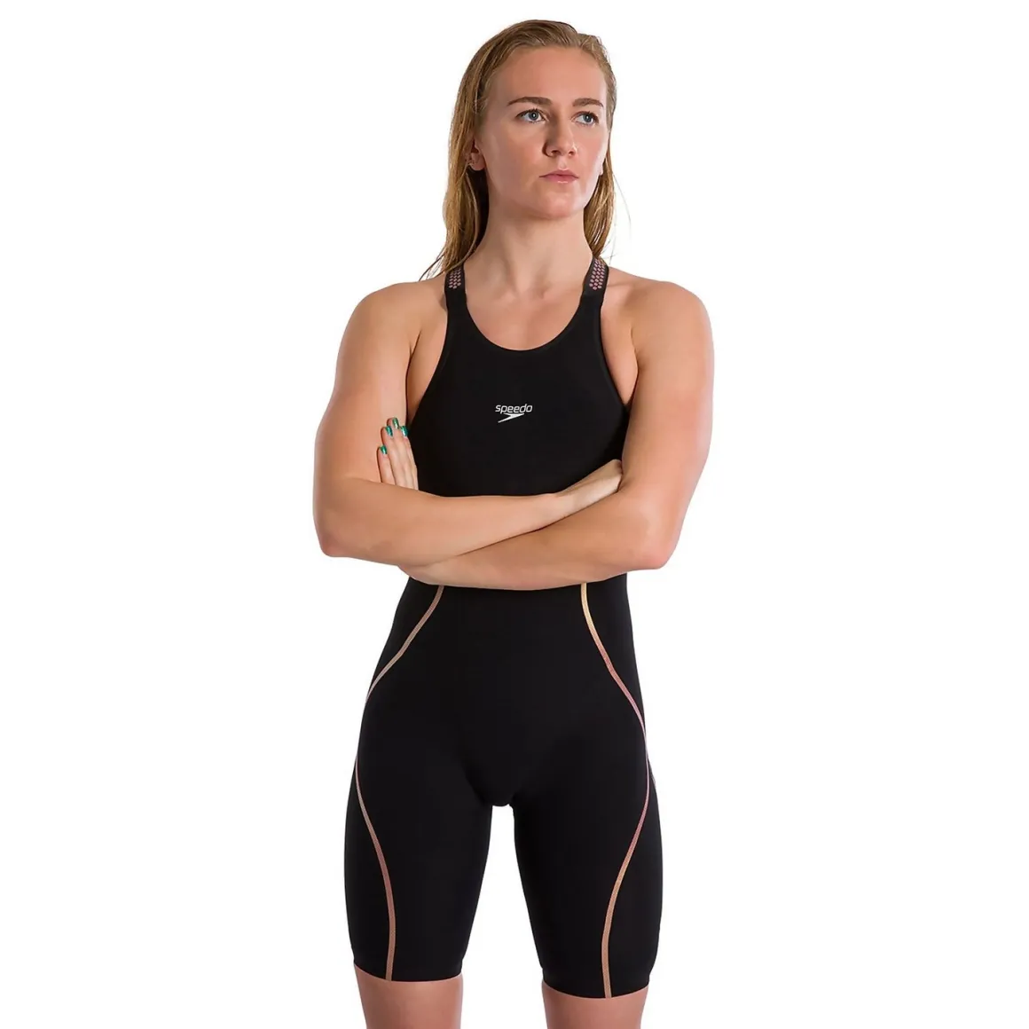 Fast. Powerful. Flexible. Power your way to first with the Fastskin LZR Pure Intentœ our newest elite competition suit, inspired by the worlds fastest sprinters. The unique triple-fabric construction is engineered to enhance both compression and flexibility, while shark skin-mimicking texture creates micro vortices along the suits surface, helping reduce drag and encouraging forward propulsion. Targeted Compressive Layers help keep your core engaged, enabling you to ride higher in the water. Flexible zones make the process of getting into the suit easier, while precision straps offer low-profile comfort. It pure speed, pure Speedo.