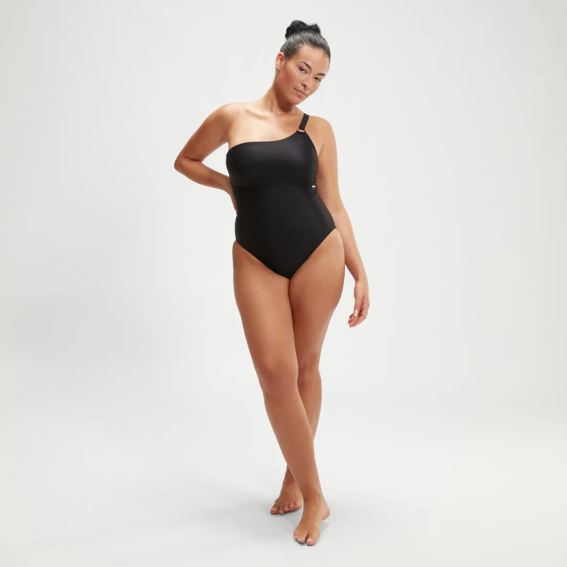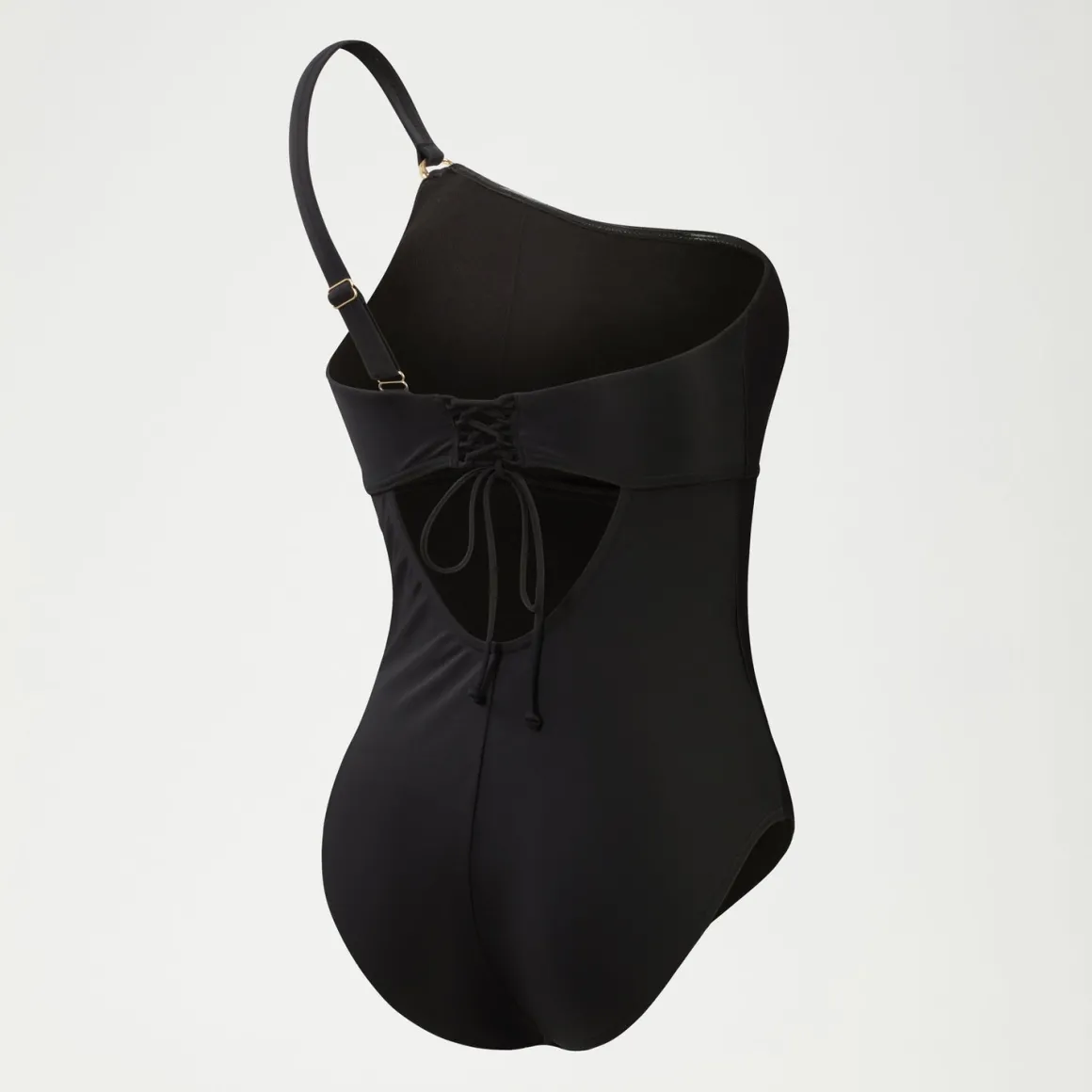 Oozing poolside glamour, this sleek black Asymmetric Shaping swimsuit features a sophisticated one-shoulder neckline and a stunning laced back for a customised fit. The chic design is finished with an embossed gold ring at the adjustable strap and includes removable bra pads for support and shaping. Cut from our premium, comfortable body-shaping fabric, which works to smooth and contour the body, it’s ideal for the beach or pool. offering higher chlorine resistance than standard swimwear fabrics, our new shaping fabric fits like new for longer with CREORA® HighClo™. The Nylon yarn in our new shaping fabric is also made from 100% pre-consumer waste, such as waste fabric from factories.
